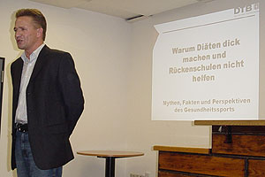 Gerade die kalte Jahreszeit mit ihrem kurzen Tageslicht und den langen Abenden bietet sich für die vielen Lauftreffs im Hessischen Leichtathletik-Verband an, mit etwas Theorie und Praxis die Läuferzeit interessant zu gestalten. Dabei sind, um auch neue Lauftreffler zu gewinnen, gerade etwas provokante Themen geeignet, Interesse an der regelmäßigen gesunden Bewegung zu wecken. So hatte zum Beispiel der Lauftreff ITC Neu-Isenburg mit Jörn Rühl, Referent für Fitness- und Gesundheitssport beim DTB Frankfurt, zu einem Vortragsabend nach Neu-Isenburg in die Sporthalle im Sportpark eingeladen. Jörn, der gemeinsam mit dem HLV auch den letztjährigen Turnfestlauf in Frankfurt organisierte, bescherte mit dem mehr als fragwürdigen Thema „Warum Diäten dick machen und Rückenschulen nicht helfen?“ ein volles Haus. Dabei wurde klar, dass besser nur die regelmäßige Bewegung in Zusammenhang mit ausgewogener, vollwertiger und vor allem nicht zu reichlicher Ernährung hilft, fit und gesund zu werden und zu bleiben. Denn all die Diäten mit dem sogenannten Jojo-Effekt, aber auch die relativ passiven Bewegungen in Rückenschulen helfen wenig, der Todesursache Nr. 1, den Herz- und Kreislauferkrankungen, vorzubeugen. Bewegung ist Leben, das heißt nur körperlich aktive Personen sind im Alltag belastbarer, fühlen sich fit, stärken damit ihr Immunsystem und produzieren so mehr Abwehrzellen. So ist der beste Weg zur Gesundheit immer noch der Geh- oder Radweg statt der Autonutzung und das Treppensteigen statt Fahrstuhlfahren. Sanfte, ausdauernde Bewegung, wie sie gerade bei unseren Lauftreffs mit Walking, Nordic-Walking und Laufen regelmäßig praktiziert wird, hilft auch bei Arthrose und Osteoporose. Natürlich wirken zusätzlich Gymnastik und Muskeltraining besonders auch älteren Menschen zu der Beweglichkeit und Muskelkraft, die Verletzungen durch eventuelle Stürze verhindern oder mindern. Leider leben die meisten von uns heute in einer verkehrten Welt mit zu wenig Bewegung und zu guter Ernährung. Keine Zeit? Die Ausrede gilt nicht um gesunde Bewegung in seinen Tagesablauf einzubauen und so den Kampf mit Fettleibigkeit und Muskelschwäche aufzunehmen. Mit eindrucksvollen Schaubildern und anschließenden praktischen Koordinationsübungen in der Sporthalle ging ein lehrreicher Abend zu Ende, der zum Nachahmen aufforderte. Dabei können z. B. auch die Themen der Grundausbildung oder Fortbildung Lauftreffbetreuer des HLV verwendet werden, die in diesem Jahr wieder an mehreren Terminen stattfinden. Näheres bzw. Anmeldung unter www.hlv.de unter Breitensport, Aus- und Fortbildung. Christian Andersch Pressesprecher Breitensport
