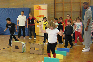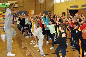 „Wer kennt Kamghe Gaba?“, fragt Moderatorin Dagmar Schmidt die knapp 100 Kinder in der Sporthalle der Otto-Dönges-Schule. Keiner meldet sich, der 400-Meter-Sprinter der LG Eintracht Frankfurt lacht. Bei dem Rosbacher Leichtathletik-Aktionstag unter der Federführung des Hessischen Leichtathletik-Verbandes mit Unterstützung der Getränkemarke Rosbacher in Nidda hatten die Dritt- und Viertklässler mit ihren Lehrern durchweg viel Spaß und lernten Einiges über die Leichtathletik sowie die passende Ernährung dazu. Und lernten auch Kamghe Gaba, den „Promi“ der Veranstaltung, kennen. Rund 1,5 Stunden konnten sich die auf sechs Gruppen verteilten Kinder an ebenso vielen Stationen mit vier Schwerpunkten austoben. Doch zunächst führten Dagmar Schmidt und Kamghe Gaba ein Aufwärmprogramm durch. Gaba war dabei leicht gehandicapt, wegen einer Verletzung konnte er keine schnellen Bewegungen machen. Gekonnt hielt Schmidt die Masse bei Laune, nach den abschließenden Dehnübungen von Gaba ging es an die Stationsarbeit. An der ersten Station stand der Lauf im Mittelpunkt, „schnell weg, schnell drüber und schnell weiter“ ging es unter der Anleitung von Gaba über Blockxs-Elemente, außerdem über kleine Hindernisse und Bananenkartons. Der 24-Jährige Olympiateilnehmer hatte sichtlich Spaß am Training geben – aufmunternd klatschte er bei guten Leistungen seiner Schützlinge; den Zeigefinger mit einem mahnenden, aber lachenden Blick zeigte er, wenn jemand beim Zurücklaufen den falschen Weg nahm. Bei der Wurfbude danach konnten die acht- bis zehnjährigen Kinder ihre Treffsicherheit unter Beweis stellen, ähnlich wie beim Büchsenwerfen mussten Hütchen in verschiedenen Höhen mit unterschiedlichen Techniken abgeworfen werden. Beim Sprung wurden Fahrradreifen und Ringe genutzt, um mit Spiel und Spaß weiter die Koordination der Kinder zu schulen. Die vierte Station, die im Parcours je einmal angelaufen wurde (pro Station 15 Minuten), galt zum Ausruhen und Durchschnaufen – bei einem Rosbacher-Getränk mussten einige (leichte) Fragen beantwortet werden, mit dem ausgefüllten Quizzettel nahmen die Kinder später an der Verlosung teil. Nach dem sportlichen Teil stellte Nadja Miklis vom Institut für Sporternährung Bad Nauheim die richtige Ernährung für die Kinder beim Sporttreiben vor. „Wer weiß, wo viele Kohlenhydrate drin sind“, fragte sie in die Runde – Kartoffeln und Äpfel waren die ersten Antworten. Was passiere, wenn die Ernährung nicht stimme, zeigte sie anhand von Videos, bei den Leichtathleten den Start verschliefen oder in den Wassergraben fielen. Bei der anschließenden Verlosung gab es fünf glückliche Gewinner/-innen von Rosbacher-Paketen mit unter anderem einer Sporttasche. Außerdem erhielt jedes Kind einen Schlüsselanhänger, eine Kappe – und freilich eine Urkunde. Danach war nur noch Kamghe Gaba im Einsatz, denn seine Autogramme waren gefragt. Die Niddaer Kinder hatten also den Langsprinter kennengelernt – spätestens, nachdem sie ihn zuvor über Schuh- und Körpergröße, seine Breakdance- und Basketballfähigkeiten sowie seine Lieblingssportart (die nicht ganz erst gemeinte Antwort: „Eishockey, klar“) ausgefragt hatten. Gaba schrieb sich die Finger wund, und hatte dabei einen ganz hartnäckigen Fan. „Kann ich deine Telefonnummer haben, bitte, bitte“. Gaba rückte sie zum Leidwesen des jungen weiblichen Fans jedoch nicht raus. Michael Wiener Pressesprecher Kreis Wetterau Bundesjugendspiel- und Laufabzeichen-Wettbewerb 2007/2008 Die diesjährigen Gewinner der vier Rosbacher Leichtathletik-Aktionstage 2008 auf einen Blick: Mittwoch, 05.11., Grundschule Elz Süd, 65604 Elz Donnerstag, 06.11., Otto-Dönges-Schule, 63667 Nidda Mittwoch, 12.11., Schule Königstor, 34119 Kassel Donnerstag, 13.11., Schloss-Schule, 64646 Heppenheim