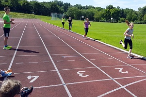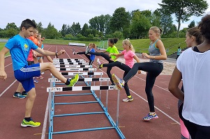 Nach dem verregneten Start genießen die Teilnehmer des Camp 2 nun die Sommerferien bei Leichtathletik und Sonnenschein. Die Teilnehmer vom Camp 1 schrieben bereits ihre Tagesberichte mit ihren Erlebnissen, nun folgen einige weitere Camp-Tage der älteren Teilnehmer: Tag 2 Camp2 – 28.07 von Estelle, Anastasia und Anna: Am Freitag hatten wir einen langen Trainingstag. Er begann mit dem Frühstück um 8.00 Uhr. Danach folgte die erste Trainingseinheit, die dem Sprint gewidmet war. Zum Aufwärmen haben wir ein Spiel gespielt, sich etwas gedehnt und einige Koordinationsübungen gemacht. Dann wurden so genannte Ins and outs gemacht, dabei sprintet man das erste Stück und im zweiten Stück bekam man eine Aufgabe, wobei man auf eine bestimmte Technik achten sollte. <ENDE/>Zuletzt teilte sich die Gruppe, die erste lief eine Sprintpyramide und in der zweiten wurden 200m gelaufen. Dann folgte das Mittagessen. Nach dem Essen hatte man Freizeit, die die Jugendlichen nutzten um zu spielen und sich auszuruhen. Nach der kurzen Pause ging es wieder zum Stadion. Wir dehnten uns ausgiebig und machten und so warm, dass wir 100m für das Deutsche Sportabzeichen laufen konnten. Jeder lief eine gute Zeit. Nach dem Sprint folgte der Weitsprung, der ebenfalls für das Sportabzeichen notwendig war. Nachdem jeder gesprungen war, fingen wir an für Dreisprung zu üben, indem wir unterschiedliche koordinative Übungen machten, um so dem Dreisprung näher zu kommen. Am Ende folgte ein kleiner Wettkampf, bei dem zwei Teams gegeneinander antraten. Nach dem Abendessen kam die letzte Einheit, die zum Kraftaufbau im Bereich Bauch diente. Zum Warmmachen tanzten wir Zumba. Dann kamen drei Mal sechs aneinandergereihte Übungen und dann eine kurze Pause. Danach war jeder am Ende seiner Kräfte und hatte seine ganze Energie aufgebraucht, sodass wir früher schlafen gingen als den Tag zuvor.