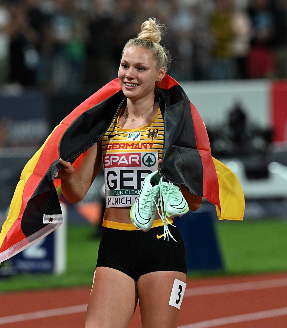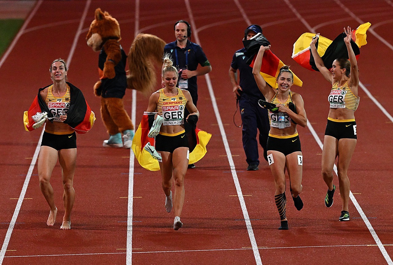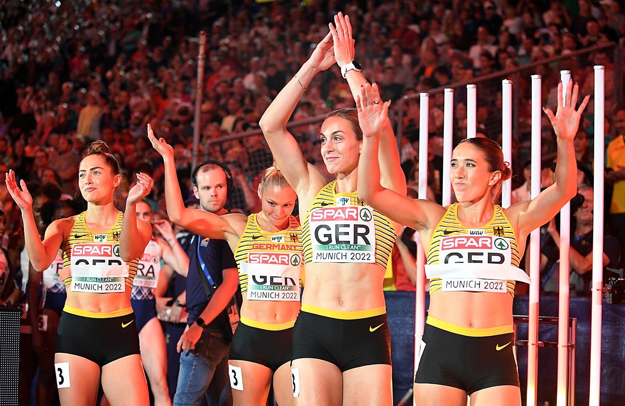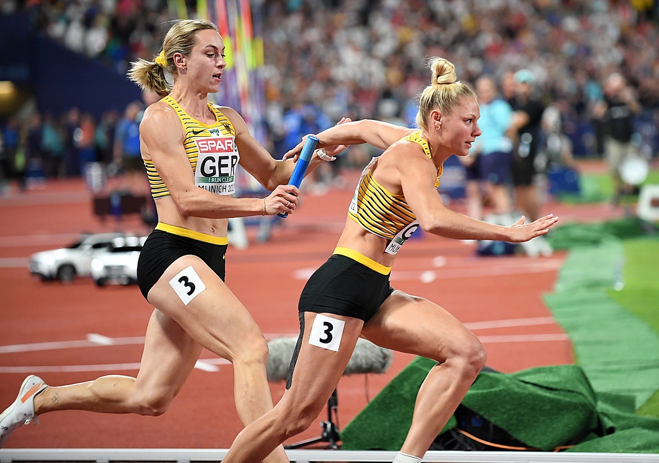 Das Beste zum Schluss - die deutsche Sprinterinnen holen im letzten Rennen der Europameisterschaften den Titel über 4x100 Meter. Gleich die Hälfte des Teams kam vom Sprintteam Wetzlar. Lisa Mayer auf der zweiten Position und ihre Vereinskollegin Rebekka Haase auf der Zielgeraden hatte gehörigen Anteil daran, dass es für Deutschland wieder einmal Gold mit der Sprintstaffel gab. Zuletzt war dies vor zehn Jahren bei den Titelkämpfen in Helsinki der Fall.