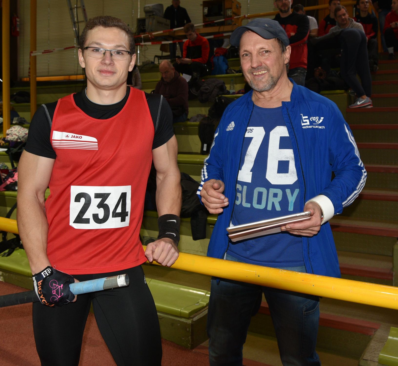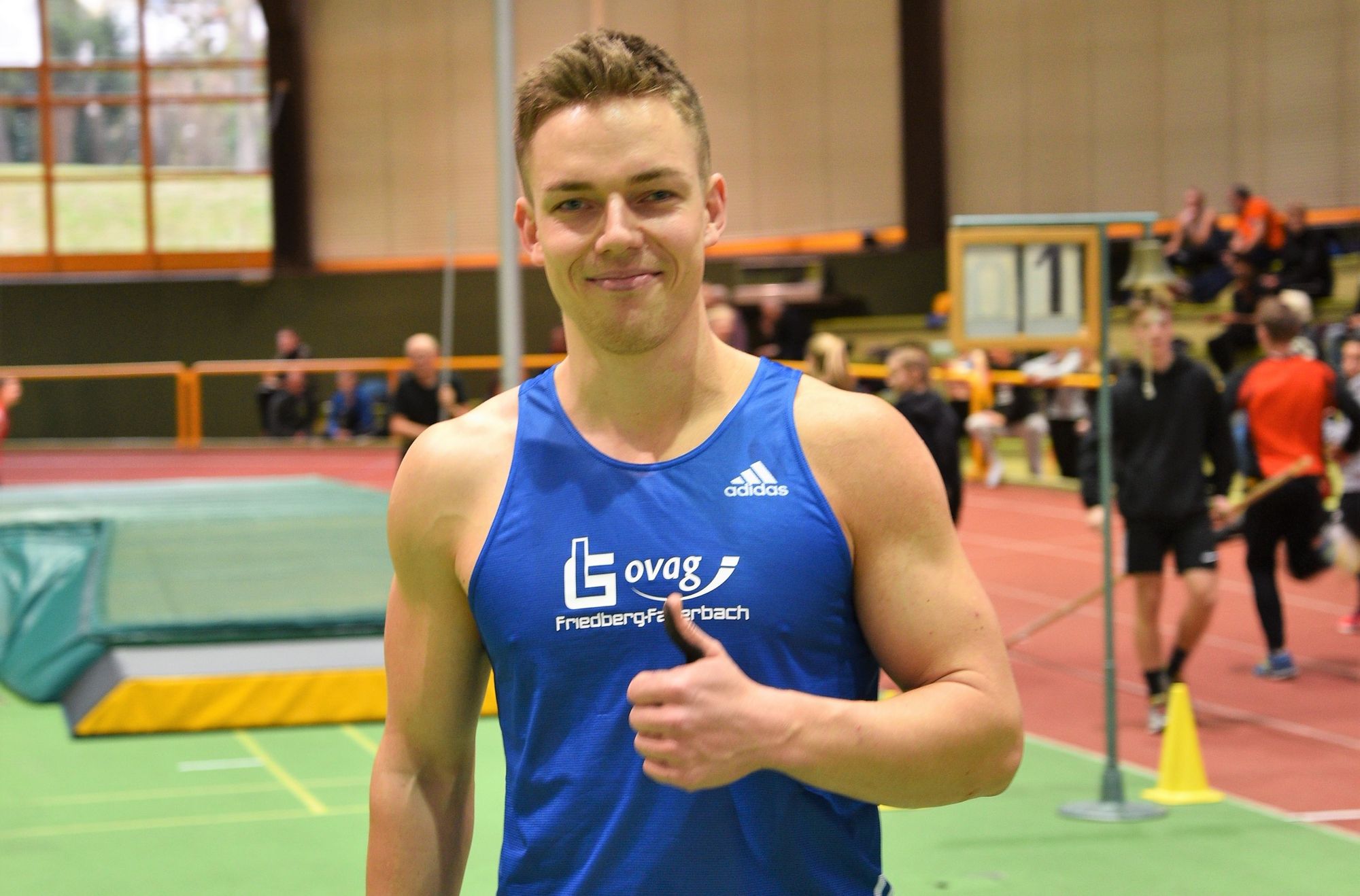 Einen Doppelsieg feierte auch ihr Vereinskollege René Koknat über 60 Meter in persönlicher Bestzeit (7,06) sowie über 200 Meter (23,31). Spannung bis zum letzten Versuch gab es im Weitsprung. Hier überzeugte Artur Scherflink (LAV Kassel) im vierten Versuch mit 7,18 Metern. Diese Leistung konnte Lennart Genz (Wiesbadener LV) im letzten Versuch mit 6,98 Metern nicht mehr toppen.