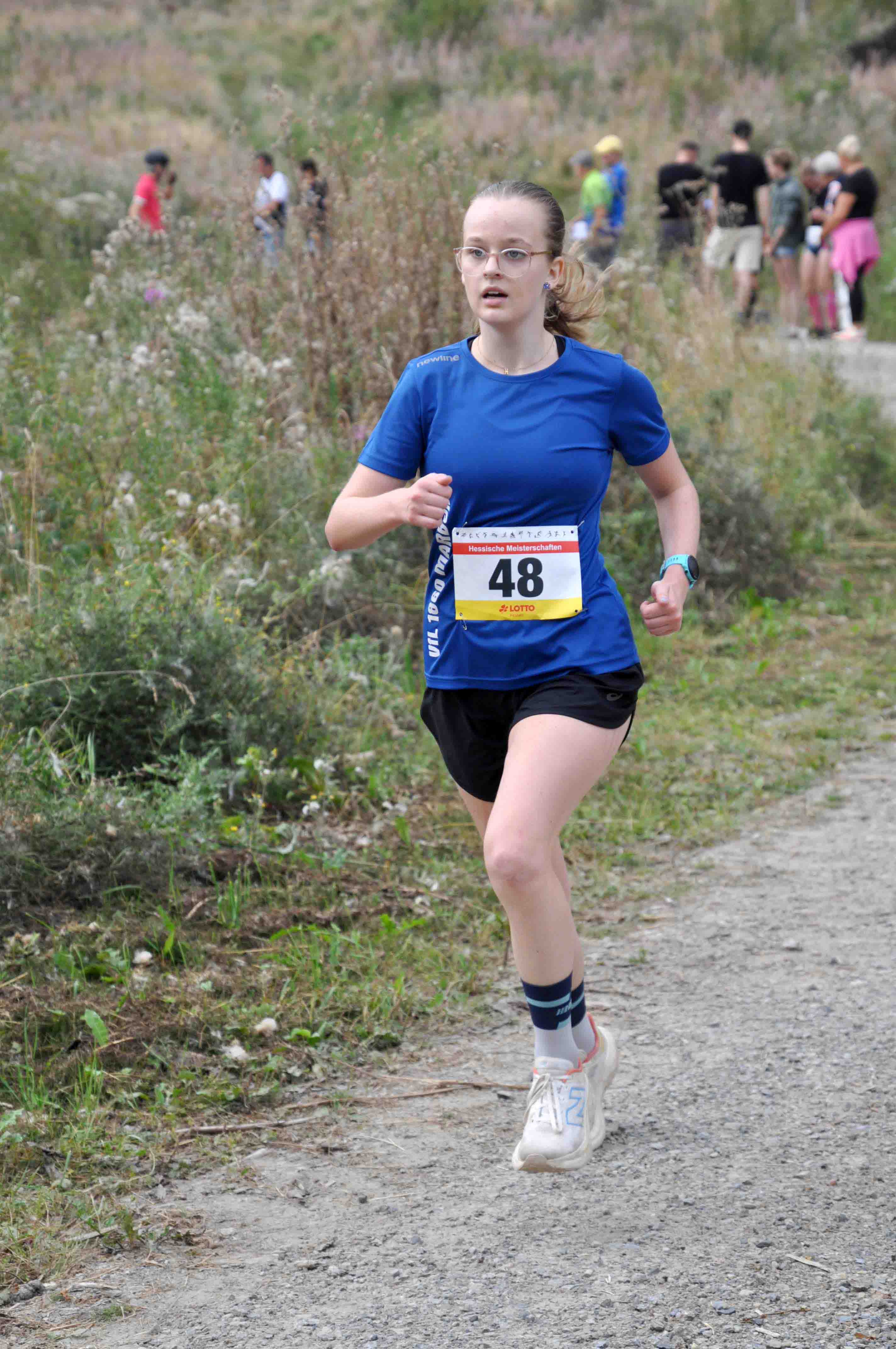 Ein ähnliches Bild bot sich bei den Frauen zumindest für die Siegerin. Clara Costadura, Spiridon Frankfurt, deutete ebenfalls auf den ersten 100 m an, dass der Sieg nur über sie ging. Mit ca. zwei Metern Abstand folgte ihr Sarah Winterstein, SSC Hanau-Rodenbach. Nach 48:16 min. beendete Clara ihr Rennen als Hessische Meisterin. Kurz vor dem Ziel gab es für sie jedoch einen Schreckmoment, als ein SSC-Nachwuchsläufer meinte, sie unbedingt noch überholen zu müssen. "Ich hatte gar nicht damit gerechnet und mich deshalb erschrocken", meinte sie anschließend. Mit 37 sec. Rückstand wurde Maja Severloh, SSC Hanau-Rodenbach, Vizemeisterin, vor Susanne Heinbach, LG Wettenberg, die 98 sec. später Dritte, zugleich aber auch Seniorenmeisterin W50 wurde. Auf Platz 4 lief dann Sarah ein.