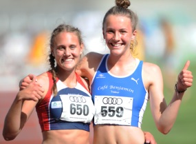 Gleich zwei Mal kletterte Sarah Vogel (LG Seligenstadt) ganz oben aufs „Stockerl“. Am Samstag stürmte sie trotz eines Strauchlers in 11,56 Sekunden zu Hürden-Gold und verteidigte einen Tag später ihren Titel im Stabhochsprung mit 3,70 Metern. Saskia Lindner (LG Eintracht Frankfurt) drehte im letzten Versuch die Reihenfolge im Weitsprung. Die Mehrkämpferin fing mit hervorragenden 5,88 Metern noch Mara Barwitzki (LG Eckental) ab, die bis dahin mit 5,68 Metern in Führung gelegen hatte. Ein kleines Ärgernis für die Eintrachtlerin war, dass bei ihrem Siegsprung der Wind (+2,3) etwas zu stark anschob. Rang drei ging durch Tamina Boppert (Alsfelder SC/5,63) ebenfalls nach Hessen. Fabienne Fliedner (TSV Friedberg-Fauerbach) ließ als Titelträgerin über 300 Meter Hürden (44,46) nichts anbrennen.