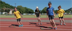Jedes Kind stellt sich in einen Reifen, die so angeordnet sind, dass für die folgenden Sprünge ausreichend Platz zur Verfügung steht. In der Gruppe wird gemeinsam und synchron eine vorgegebene Sprungfolge / Choreographie absolviert. Die vollständige Trainingskarte und weitere Details zur Übung findet Ihr hier.