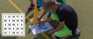 Die Kinder werden in mehrere Mannschaften mit je 4-6 Kindern aufgeteilt. Jedes Team erhält eine Bingo Karte und 25 Zahlenkärtchen. Von der Teambasis läuft das erste Kind eine vorgegene Laufstrecke und darf ein verdecktes Zahlenkärtchen aufnehmen. Zurück beim eigenen Team werd per Handschlag das nächste Kind losgeschickt. Das Kärtchen wird in der Zwischenzeit auf die richtige Position auf der Bingo-Karte gelegt. Das Team was als erstes eine vollständige Reihe, Spalte oder Diagonale gelegt hat gewinnt. Die vollständige Trainingskarte und weitere Details zur Übung findet Ihr hier.
