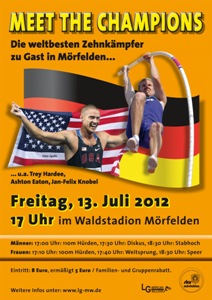 Wann gab es in der hessischen Leichtathletik einen derart hochklassig besetzten (Test-)Wettkampf wie er am 13. Juli im Waldstadion von Mörfelden ansteht? Wohl noch nie. In einem letzten Leistungstest vor den Olympischen Spielen in London werden unter anderen Zehnkampf-Weltrekordhalter Ashton Eaton (9.039 Punkte), sein amerikanischer Landsmann Trey Hardee (Zehnkampf-Weltmeister 2009 und 2011/Bestleistung 8.790 Punkte) sowie voraussichtlich alle drei deutschen Olympiateilnehmer (Pascal Behrenbruch, Jan Felix Knobel, Rico Freimuth) an den Start gehen. Die Zehnkämpfer absolvieren einen Dreikampf, der die Disziplinen eins bis drei des zweiten Tages umfasst: 110 Meter Hürden (17 Uhr), Diskuswerfen (17.30 Uhr) und Stabhochsprung (18.30 Uhr). Die LG Mörfelden-Walldorf als Veranstalter bewirbt das Mini-Meeting zu Recht unter dem Motto „Meet the Champions“. Schließlich ist der 24 Jahre alte Eaton nicht nur Zehnkampf-Weltrekordhalter, sondern auch Weltrekordhalter im Hallen-Siebenkampf mit 6.645 Punkten. Diese Punktzahl erreichte er am 10. März 2012 als Titelträger bei der WM in Istanbul. Demgegenüber nimmt sich die Teilnehmerliste bei den Siebenkämpferinnen beinahe bescheiden aus. Brianne Theisen (Kanada/6.440 Punkte) sowie die beiden EM-Teilnehmerinnen von der LG Eintracht Frankfurt, Claudia Rath (6.210 Punkte) und Carolin Schäfer (6.072), testen im Dreikampf über 100 Meter Hürden (17.10 Uhr), Weitsprung (17.40 Uhr) und Speerwerfen (18.30 Uhr).